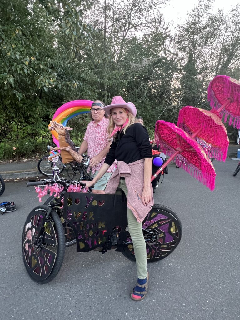 Mom and Aaron went to the weird bike race (not really a race) on Friday with their Barbie and Ken bikes. I followed them on my conspicuously ordinary one. It was still rather fun; a few people had bubble machines on their bikes which was delightful.