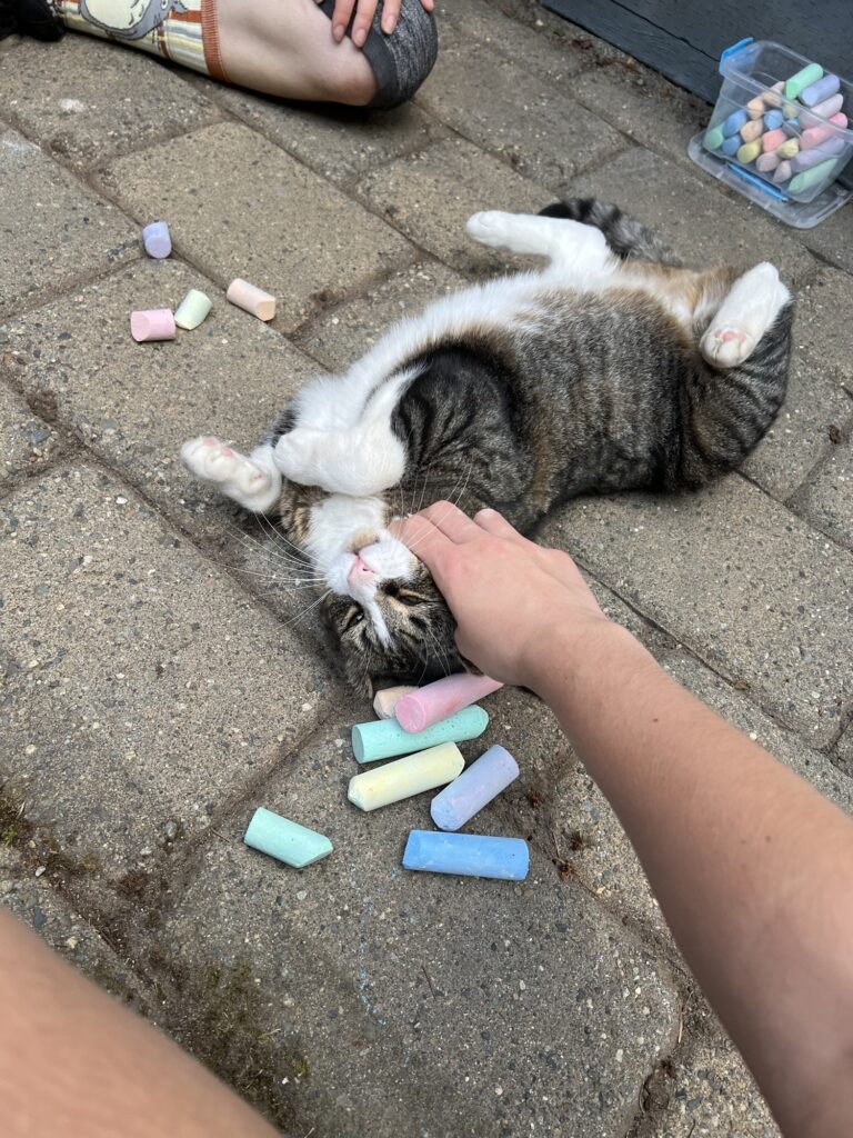 On better things, one of my friends came over yesterday and we did some chalk art. The cats were having Supervised Outdoor Time, and Paris rolled around on the chalk. Look how cute he is.