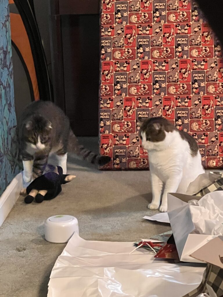 Merry Christmas! What did you get today? Among other things, I got four sweaters and new headphones. Aaron got the cats a toy that imitates a flying butterfly.